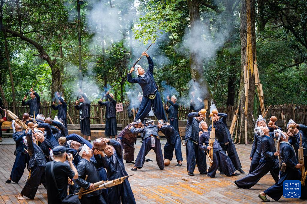 村民在贵州省从江县岜沙苗寨景区表演苗族舞蹈(8月16日摄)。新华社发(龙建睿摄)