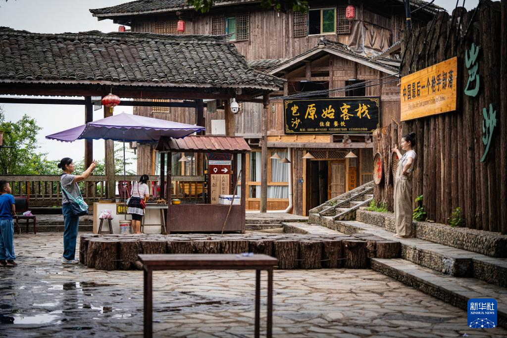 游客在贵州省从江县岜沙苗寨内游览拍照(8月16日摄)。新华社发(龙建睿摄)