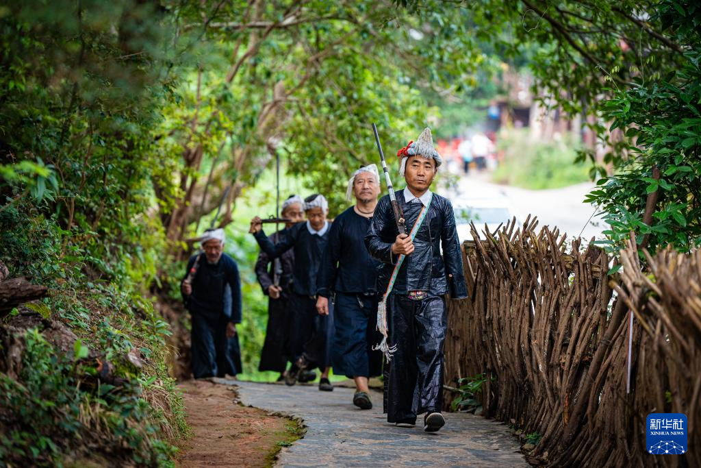 在贵州省从江县岜沙苗寨,村民准备前往表演场进行表演(8月16日摄)。新华社发(龙建睿摄)