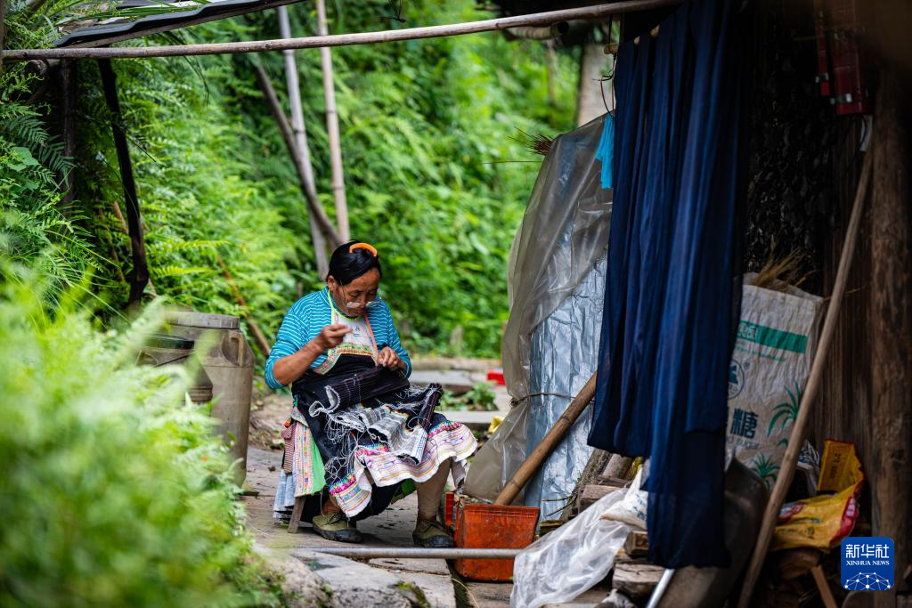 在贵州省从江县岜沙苗寨,一名村民在家门口制作刺绣(8月16日摄)。新华社发(龙建睿摄)