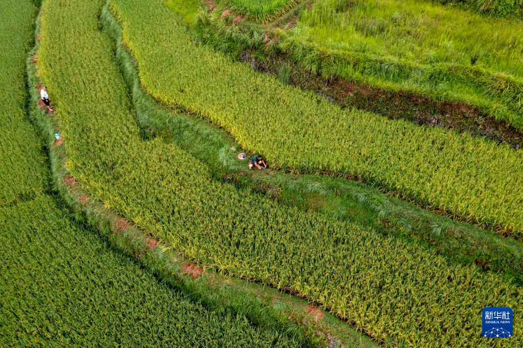 8月17日,贵州省从江县岜沙苗寨村民在稻田中劳作(无人机照片)。新华社发(吴德军摄)
