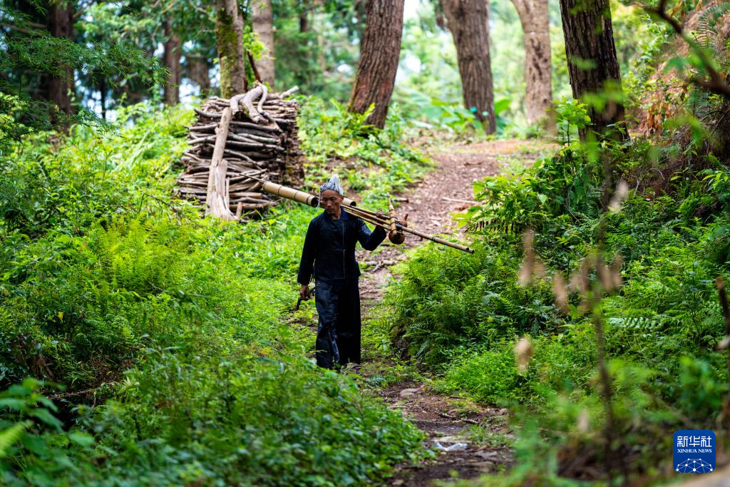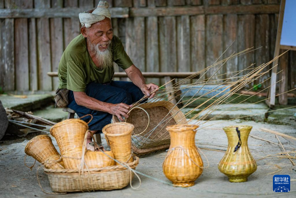 在贵州省从江县岜沙苗寨,一名村民在使用竹条制作竹篮(8月16日摄)。新华社发(龙建睿摄)