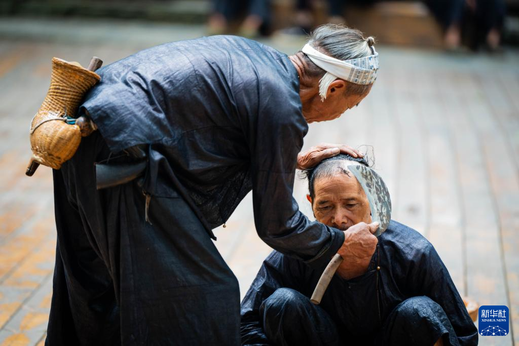 村民在贵州省从江县岜沙苗寨景区展示镰刀剃头(8月16日摄)。新华社发(龙建睿摄)
