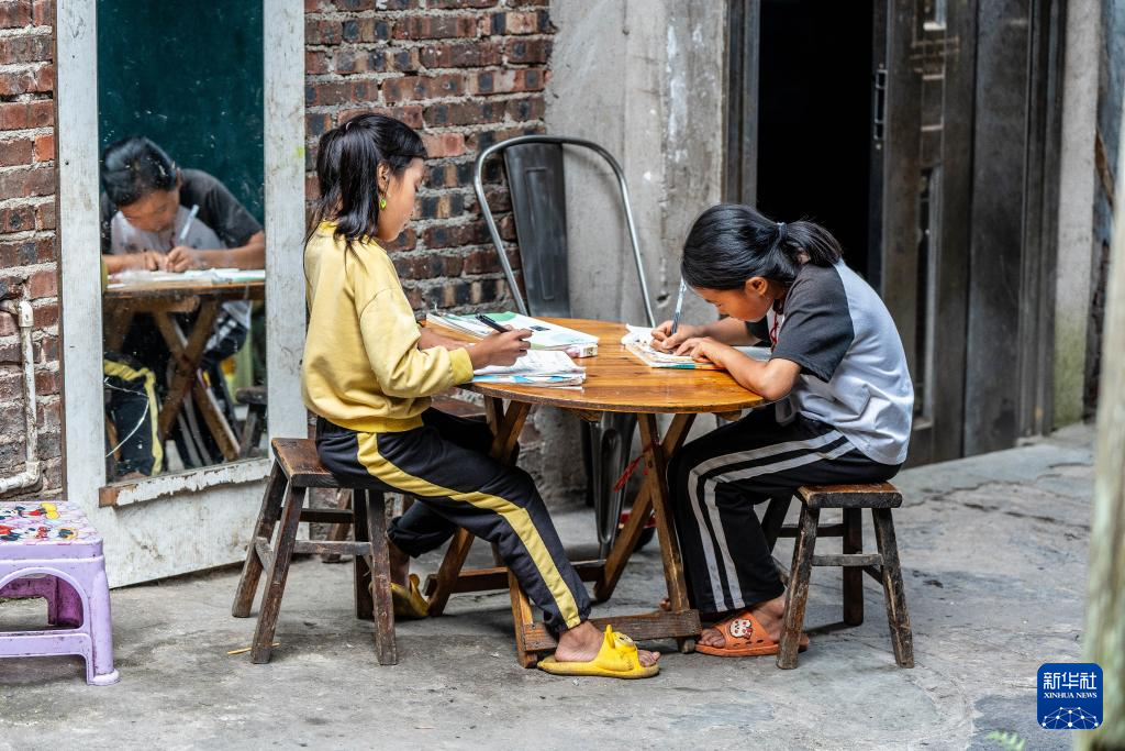 在贵州省从江县岜沙苗寨,两名小朋友在家门口写作业(8月16日摄)。新华社发(龙建睿摄)