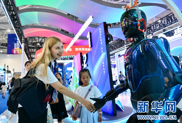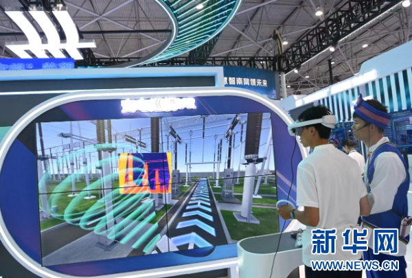 图为在南网展台,观众与“大瓦特”电力AI机器人进行问答互动交流(8月28日摄)。新华网发(赖增鹏 摄)