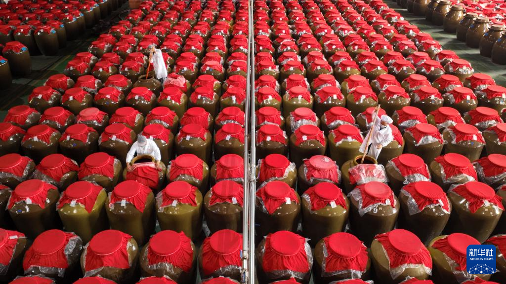 8月28日,工人在贵州省丹寨县金钟经济开发区一家红酸汤企业车间搅拌、查看红酸汤原料(无人机照片)。