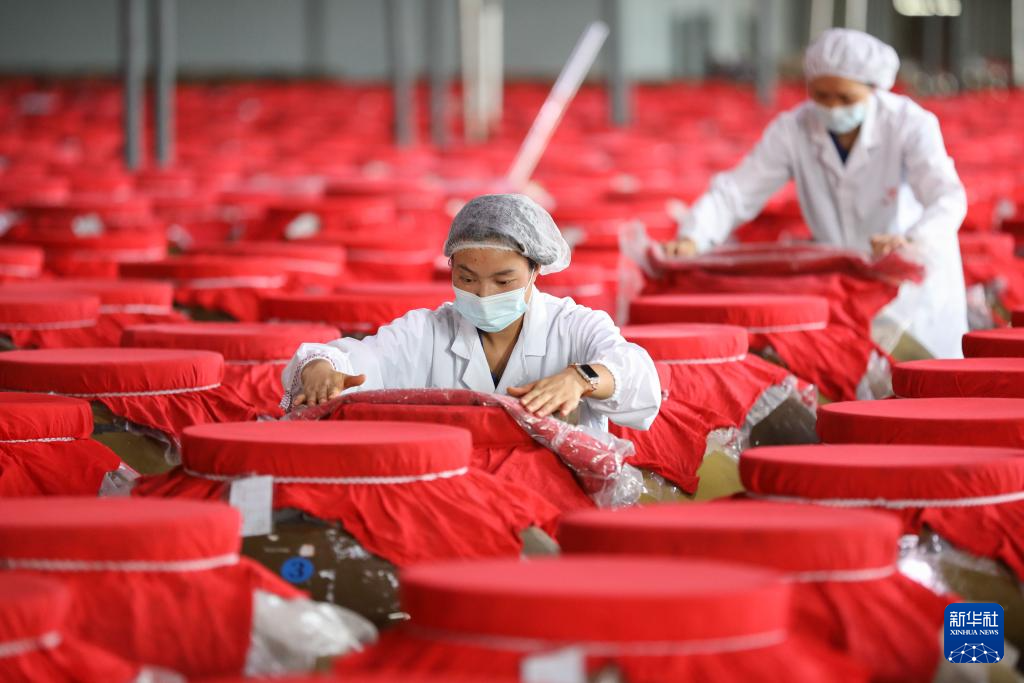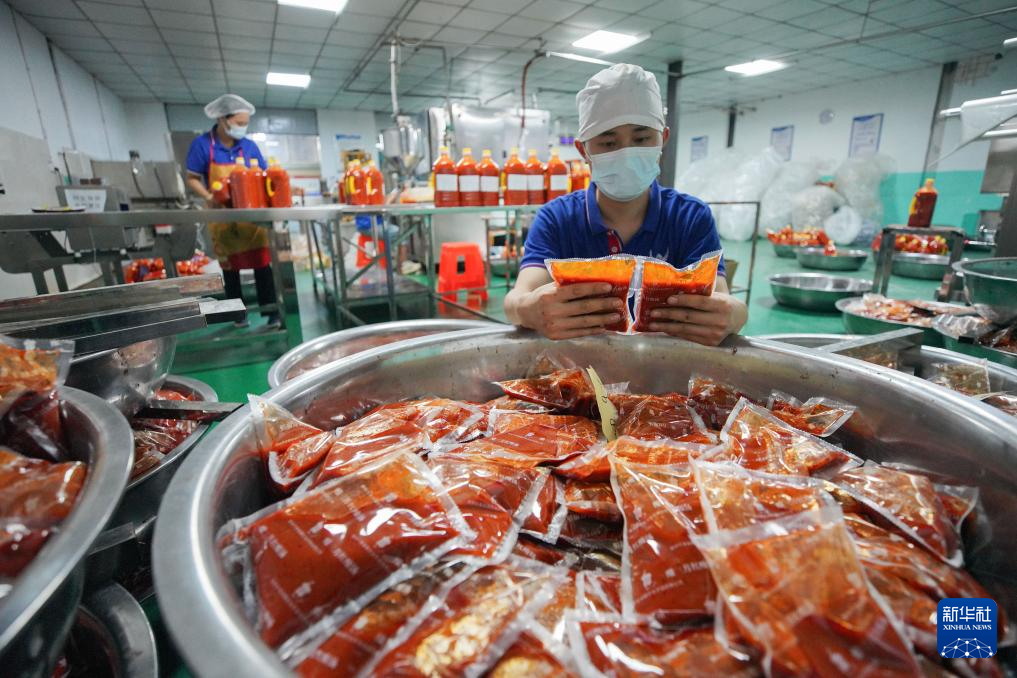 8月28日,工人在贵州省丹寨县金钟经济开发区一家红酸汤企业车间查看红酸汤产品。新华社发(杨武魁 摄)pagebreak