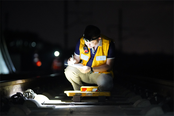 进行夜间道岔维护作业作业。(郑滔 摄)