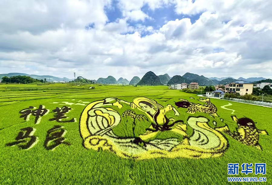 新华网贵阳9月5日电 秋风送爽,稻谷飘香。在贵州省安顺市平坝区白云镇平元村成片的水田里,稻禾随风起伏,颜色各异的水稻勾勒出一幅幅独特的“稻田画”景观,吸引了各地众多游客前来观赏和拍照打卡。
