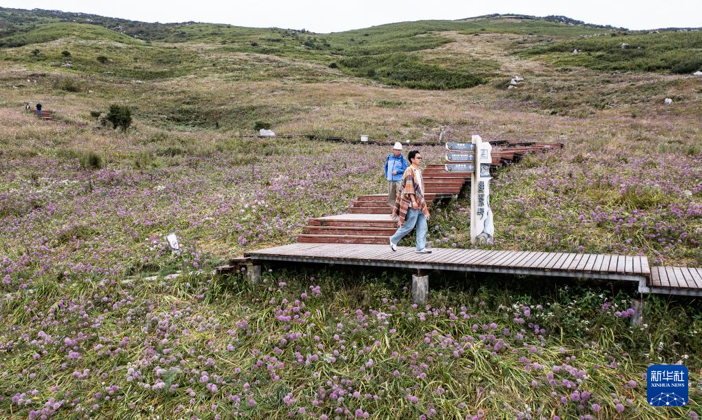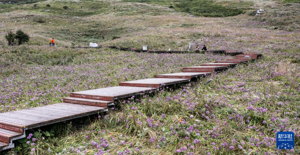 近日,贵州省六盘水市钟山区大湾镇韭菜坪景区内的韭菜花进入盛花期,紫色的韭菜花竞相绽放,吸引游客前来观光游玩。