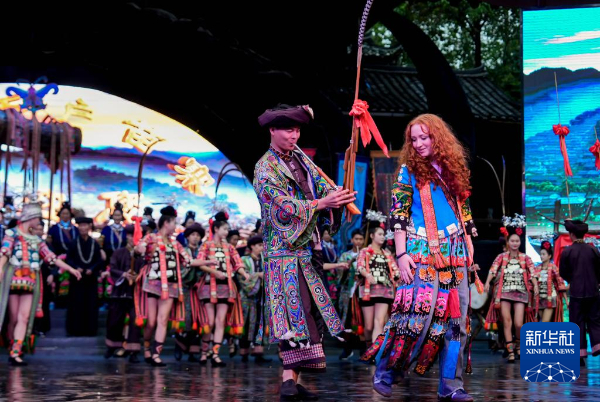 9月16日,美国青年学生在贵州省西江千户苗寨体验民族歌舞。新华社发