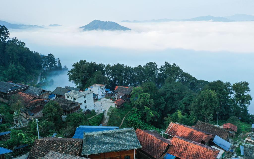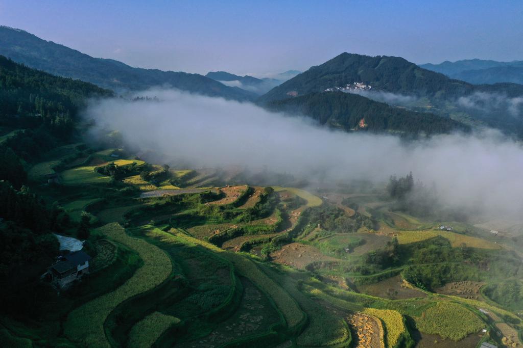 9月19日,贵州省黔东南苗族侗族自治州黎平县尚重镇洋洞村周围出现云海景观,村庄、梯田、山川在云海中若隐若现,如诗如画。