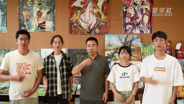 在贵州省黎平县尚重镇洋洞村,杨正熙(左二)向文艺工作者介绍“牛耕部落”整体情况(5月19日摄)。新华社记者 杨文斌 摄