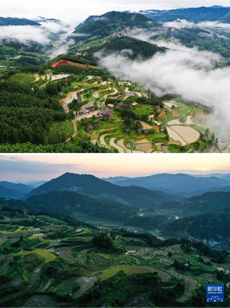 拼版照片:上图为5月19日拍摄的贵州省黎平县尚重镇洋洞村春耕时节的梯田(无人机照片);下图为9月18日拍摄的洋洞村秋收时节的梯田(无人机照片)。新华社记者 杨文斌 摄pagebreak