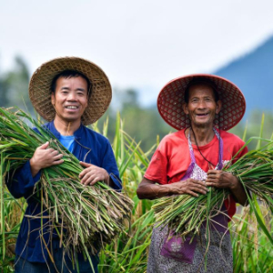 在贵州省黎平县尚重镇洋洞村,杨正熙(左)与村民展示收割的有机稻(9月19日摄)。