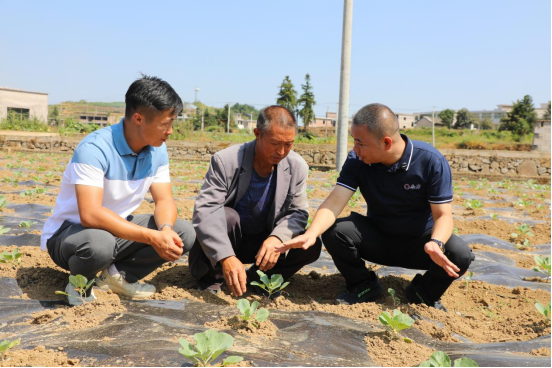 贵州合力超市集团董事长李德祥在乌当区新场镇大坝村蔬菜基地与农户查看蔬菜苗的长势。