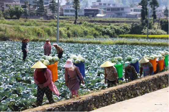 乌当区新场镇大坝村蔬菜基地的农户在收割搬运莲花白。