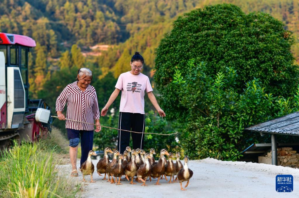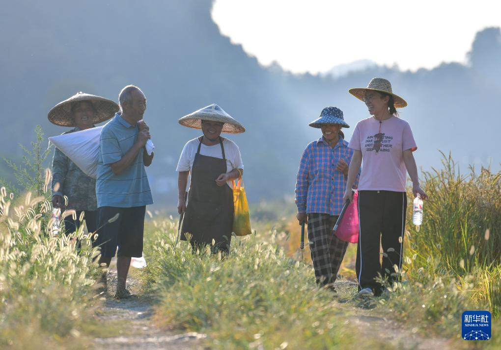 9月25日,在贵州省岑巩县注溪镇周坪村,侯佳媛(右一)与村民收割水稻种子归来途中交流。新华社记者 杨文斌 摄pagebreak