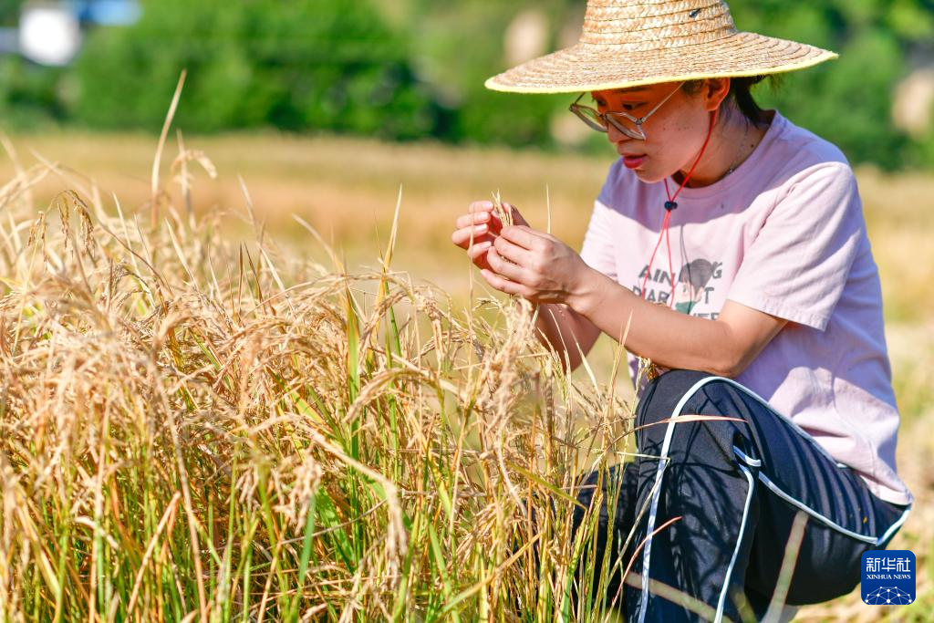 9月25日,侯佳媛在贵州省岑巩县注溪镇周坪村查看杂交水稻种子结实情况。新华社记者 杨文斌 摄pagebreak