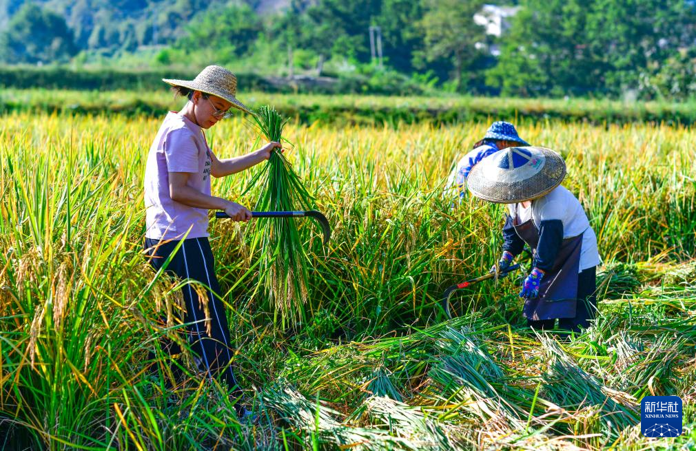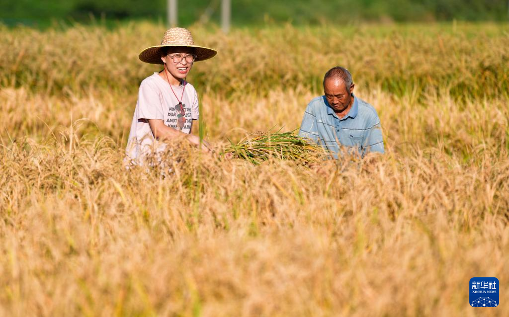 9月25日,侯佳媛(左)在贵州省岑巩县注溪镇周坪村帮助村民收割制种水稻。新华社记者 杨文斌 摄pagebreak