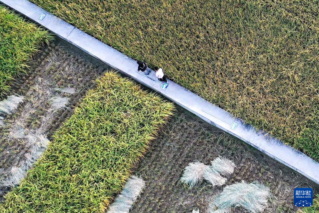 9月25日,侯佳媛(后)与驻村工作队员在贵州省岑巩县注溪镇周坪村杂交水稻制种基地做田野调查(无人机照片)。新华社记者 杨文斌 摄pagebreak