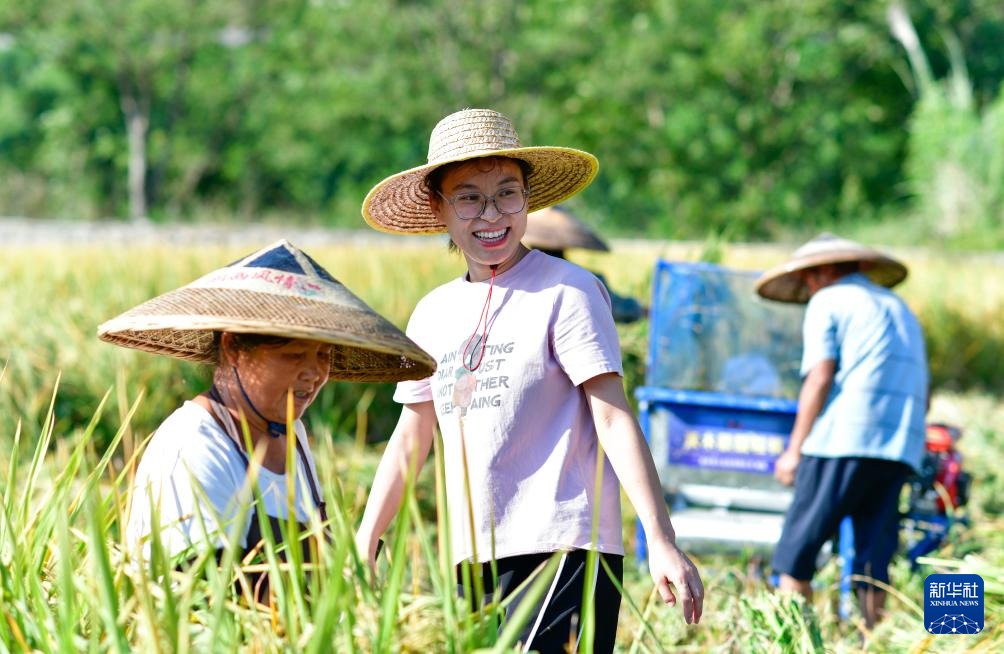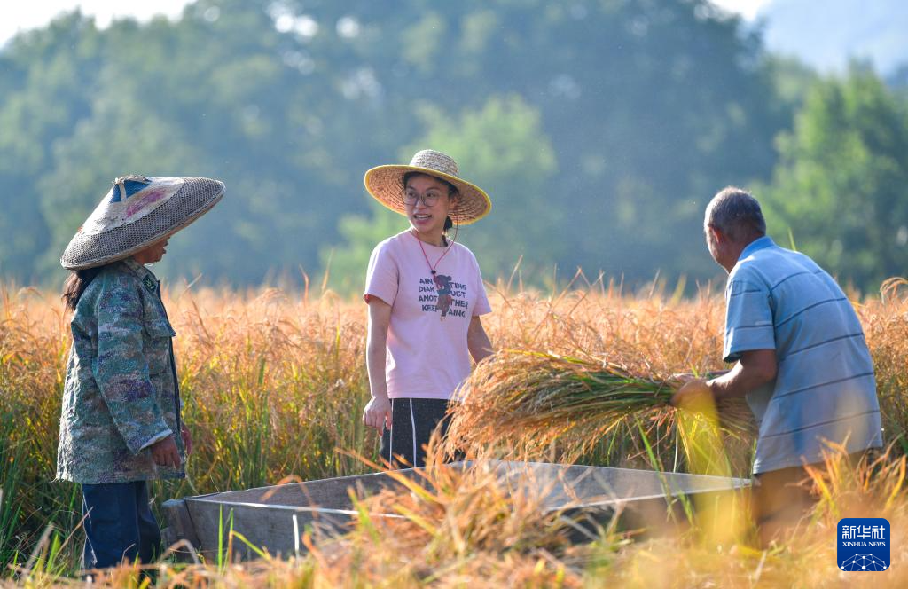 9月25日,侯佳媛(中)在贵州省岑巩县注溪镇周坪村帮助收割制种水稻时与村民交流。新华社记者 杨文斌 摄pagebreak