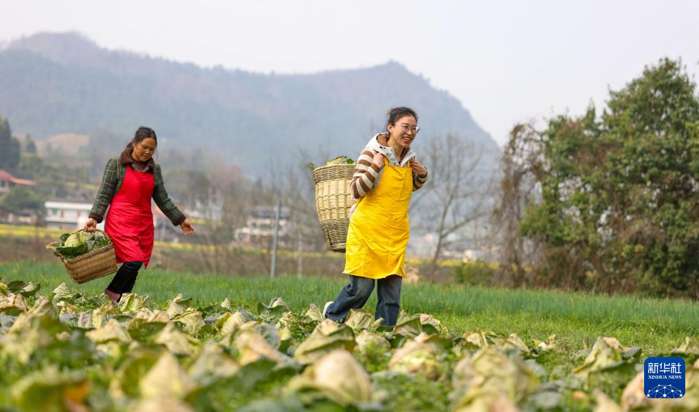 3月9日,在贵州省岑巩县注溪镇周坪村,侯佳媛(右)帮助村民采收蔬菜。新华社发(胡攀学摄)