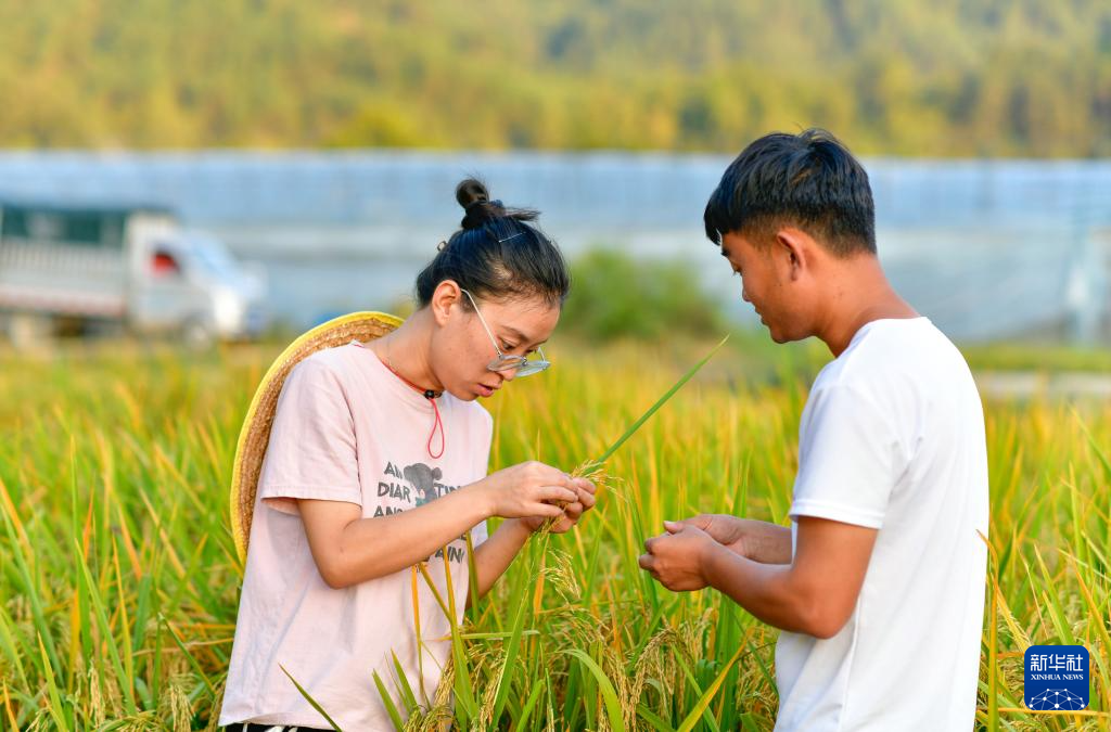 9月25日,在贵州省岑巩县注溪镇周坪村,侯佳媛(左)与种业公司工作人员查看水稻成熟情况。新华社记者 杨文斌 摄pagebreak