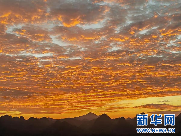 图为在凤凰山上遥望喀斯特峰丛间的火烧云。