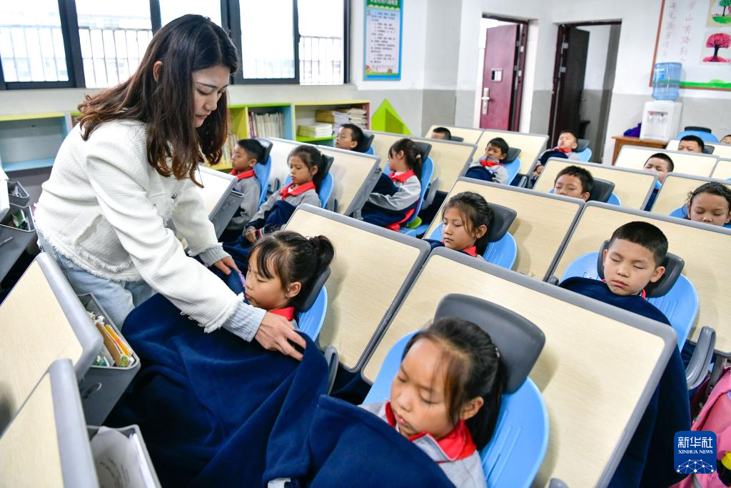 10月12日,贵州省正安县第四小学的老师为“可躺式”课桌椅午休的学生盖被子。新华社记者 杨文斌 摄pagebreak