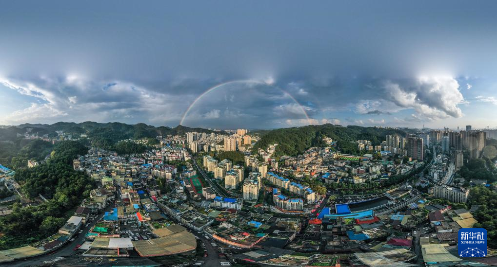 这是10月18日在贵州省贵阳市区拍摄的双彩虹景观(无人机全景照片)。