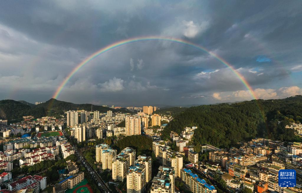 这是10月18日在贵州省贵阳市区拍摄的双彩虹景观(无人机照片)。新华社记者 杨文斌 摄