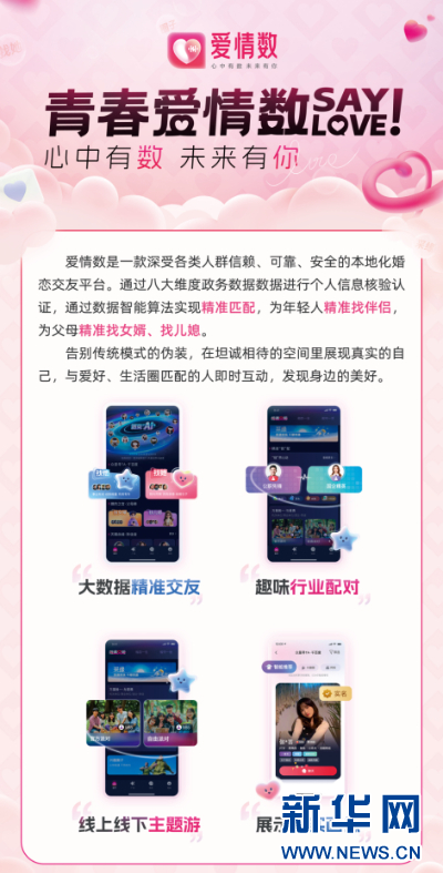 “青春爱情数”大数据智能婚恋交友服务平台由共青团贵州省委、贵州省民政厅、贵州省总工会、贵州省妇女联合会联合指导建设。平台依托贵州政务民生服务平台“多彩宝”APP“贵州青年卡”综合服务平台搭建,由多彩贵州网旗下多彩宝公司、贵商易公司建设运营,旨在应用大数据赋能青年人精准交友,通过实名认证、高效信息匹配、大数据算法模型等技术手段,对用户行为、偏好、教育背景等多维度信息进行分析,实现个性化精准匹配,打造政府指导、信息真实、数据可信的全省青年婚恋交友数智综合服务平台。