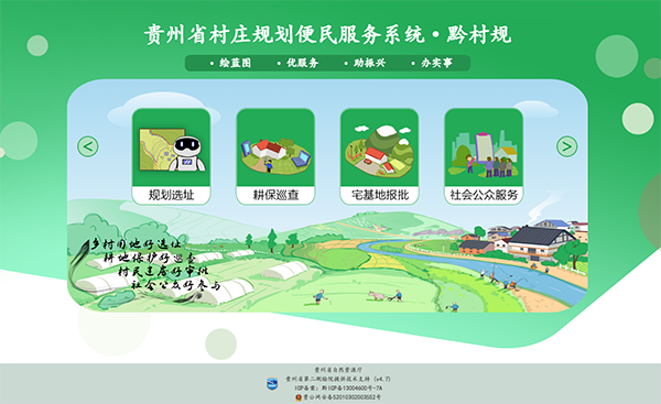 “贵州省村庄规划便民服务系统(https://www.gzczgh.cn,黔村规App)”着力解决乡村振兴中“乡村用地选址门槛较高、耕地保护缺乏有效抓手、农房报建线下审批缓慢、村民参与规划手段单一”等痛点,辅助村庄规划管理,助力耕地保护巡查,畅通宅基地报批流程,展示村庄长期发展方向和近期项目建设。