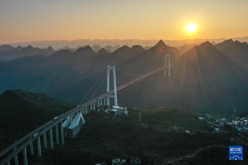 11月13日拍摄的夕照下的贵州坝陵河大桥(无人机全景照片)。新华社记者 杨文斌 摄pagebreak