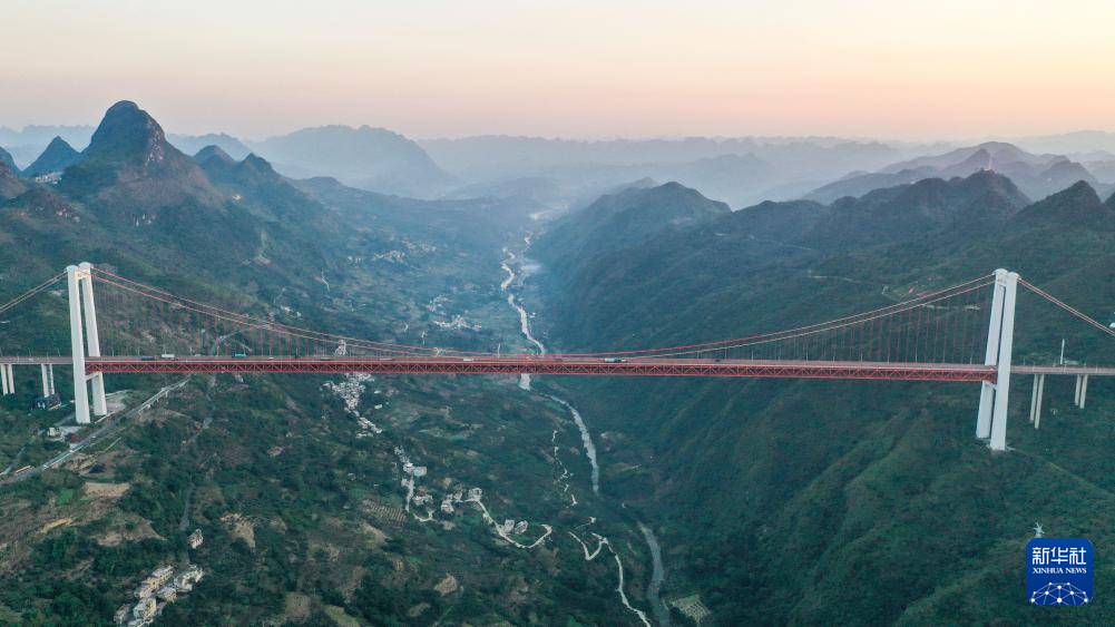 11月14日拍摄的晨曦中的贵州坝陵河大桥(无人机照片)。新华社记者 杨文斌 摄pagebreak