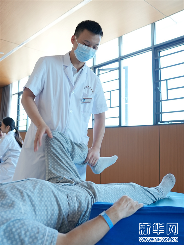 “我们以前是针灸康复科,2018年被评为贵州省级重点专科,搬到新院区后,跟针灸科‘分家’,康复科现在实际开放床位47张。”康复科主治医师张金钗介绍,科室占地面积3000平方米,分传统治疗区和康复治疗区。传统治疗区可开展普通针刺、毫火针、小针刀、三伏灸、火龙罐、微创治疗等40多种治疗项目。康复治疗区可开展运动疗法和器械训练等项目,“比如在这个300平方米的康复大厅内,病人可通过电动起立床进行站立训练、四肢联动等,目前每天约有40人在这里接受康复治疗”。