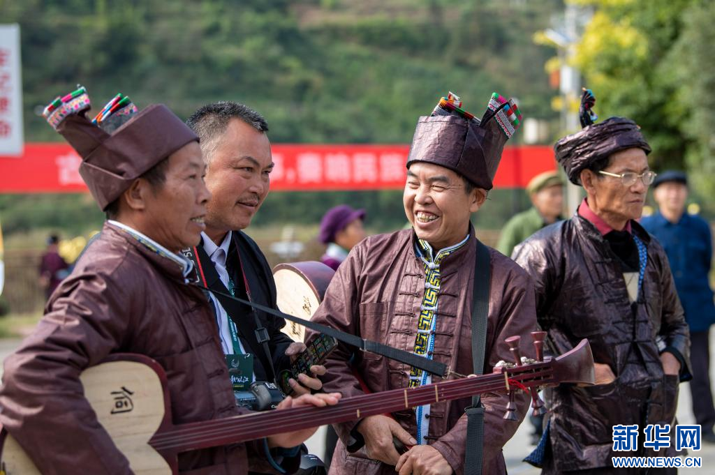 11月27日,芦笙手在贵州省从江县北上鼓楼广场进行表演。新华网发(吴德军 摄)