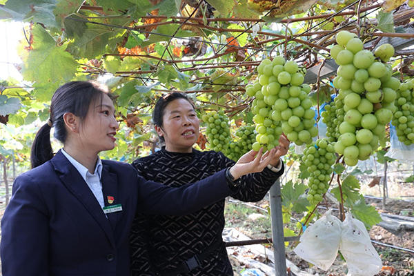 邮储银行工作人员正在了解陆安碧的葡萄基地。