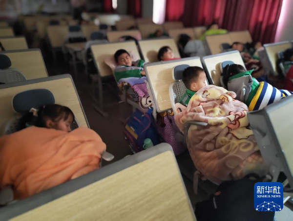 贵州省龙里县第六小学一年级的学生使用折叠式课桌椅午休。新华社记者 郑明鸿 摄