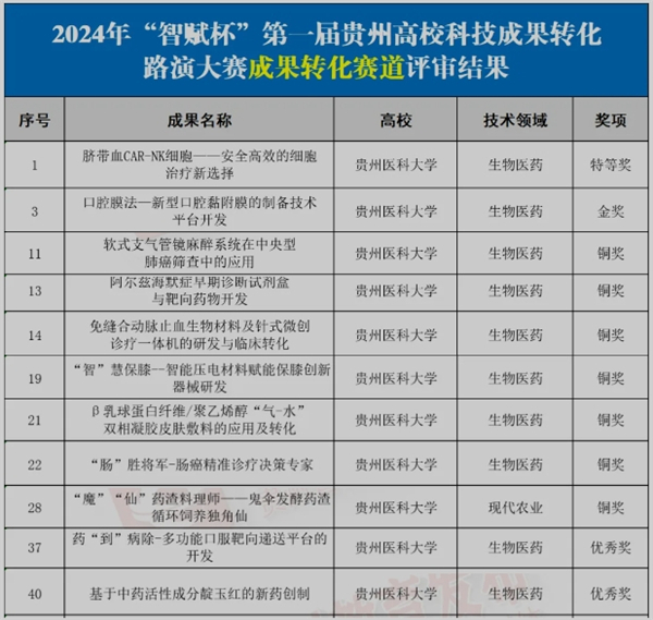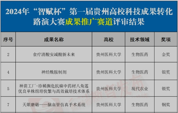 近日,2024年“智赋杯”第一届贵州高校科技成果转化路演大赛圆满结束。经过激烈角逐,贵州医科大学科技成果获评“成果转化赛道”特等奖1名、金奖1名、铜奖7名,优秀奖2名;获评“成果推广赛道”金奖1名、银奖1名、铜奖2名。