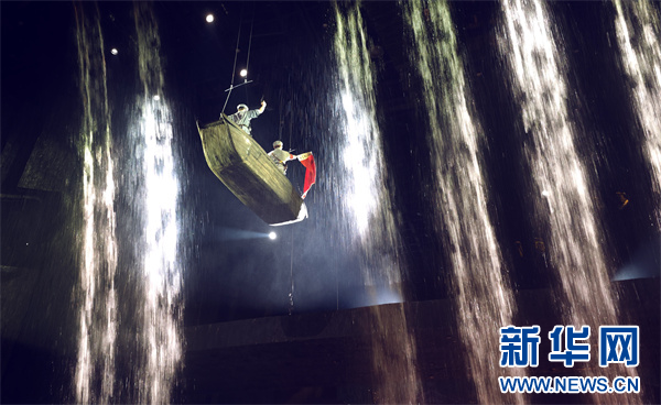 当“金沙江”从天而降时,现场观众被深深震撼,这震撼首先来自于视听的冲击,更来自于对导演团队巧思的佩服。每次演出,舞台都要被大水一次次冲刷、淹没,这势必要克服大量技术难题,据贵州伟大转折文化发展有限公司副总经理龙通成介绍,“水舞台”安置了15套高压水泵和特种水效喷头,舞台下方有600吨水供演出循环使用。