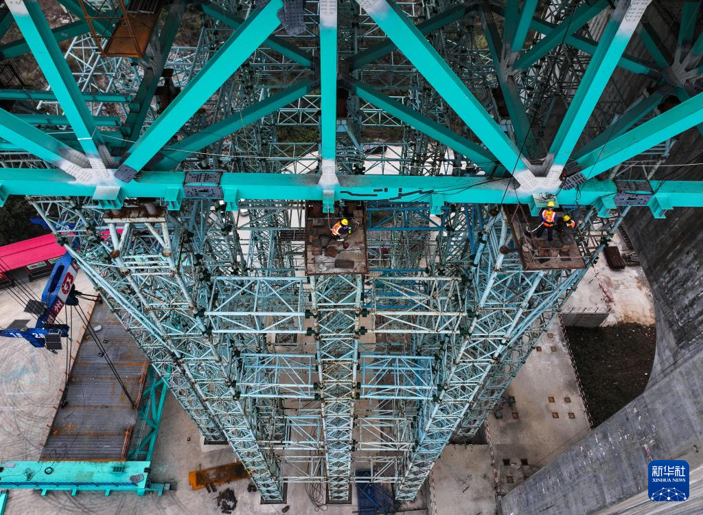 1月14日,工人在贵州六安高速公路花江峡谷大桥上施工(无人机照片)。新华社记者 杨文斌 摄