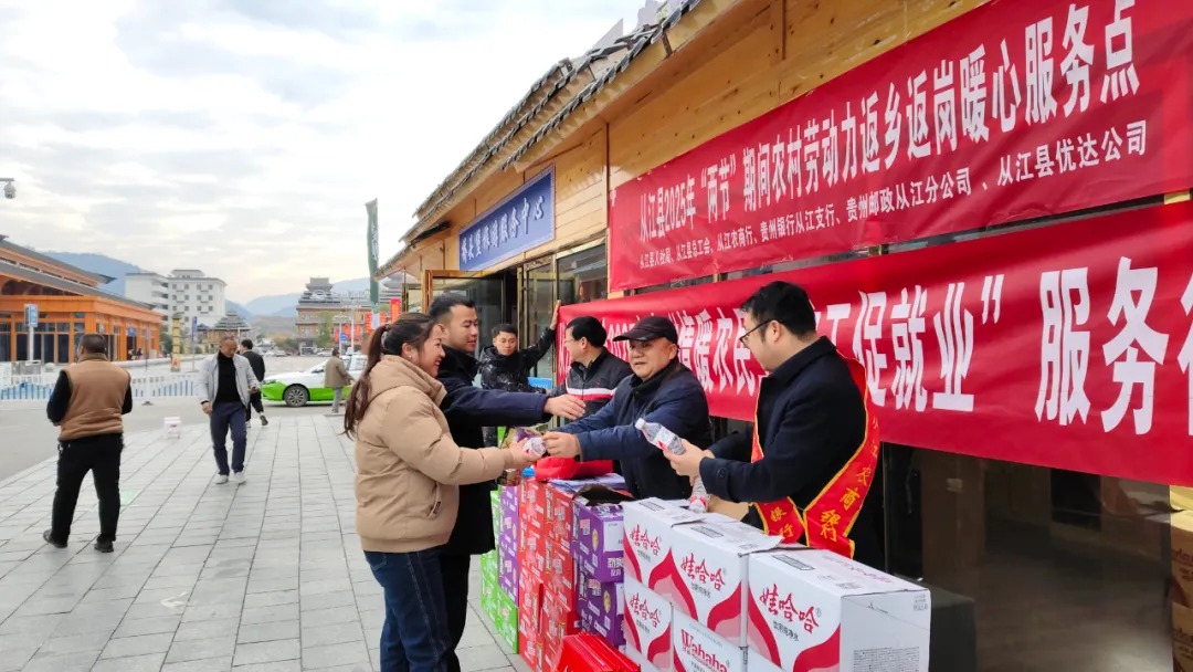 近日,在从江县2025年“两节”期间农村劳动力返乡返岗暖心服务点看到,工作人员一边为老乡们递上矿泉水和方便面,一边详细地宣传解答相关就业政策,为他们提供精准的就业指导和服务。