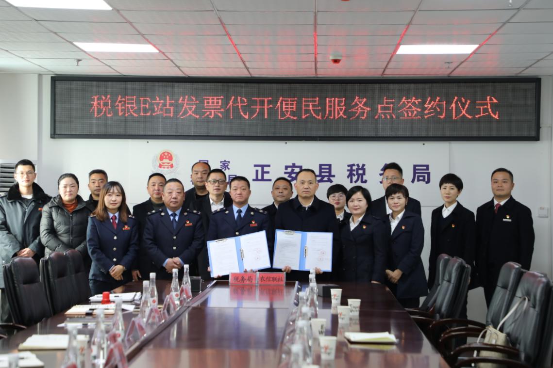 为拓宽纳税人办税开票渠道,满足企业、群众多元化办税缴费服务需求,近日,国家税务总局正安县税务局、正安县农村信用联社、正安县政务服务管理局共同举行“税银e站 发票代开便民服务点”签约仪式。