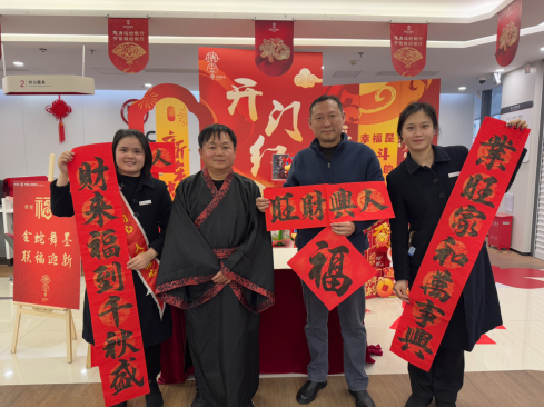 挥毫泼墨,书写新春祝福。活动现场,该行特别邀请了多名书法老师亲临指导,摆放好笔墨纸砚,邀请人们一同参与书写春联。到场群众纷纷拿起毛笔在红纸上写下了寓意吉祥的词句,一笔一画皆展现了人们对传统文化的热爱和对新年的美好期许,为蛇年春节增添了浓浓的喜庆氛围。