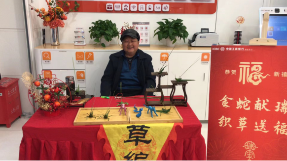 精致的草编工艺品错落有致地被摆放着,传递着新春的美好祝愿。