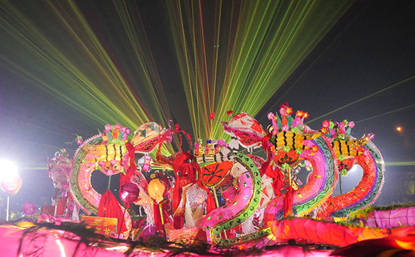 夜幕降临,瓮水长歌广场上锣鼓震天,45支龙狮队气势磅礴登场,祈福仪式和彩塘仪式相继开展。人们在龙狮见证下许愿,祈盼美好未来。