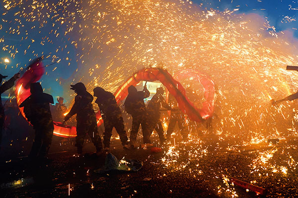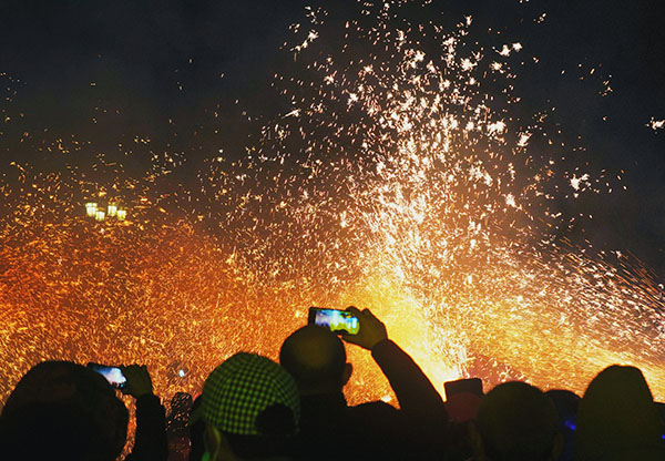 随后,万众瞩目的“嘘龙”点燃全场激情。火龙穿梭街道,大家用手中的烟花喷向龙身,火花四溅、火光如昼。而舞龙者在烟火中飞舞,将火龙舞得栩栩如生,整个场面绚丽壮观。大家尽情地欢呼、肆意地狂欢,纷纷拍照打卡留念,定格精彩瞬间。此时此刻,整个古镇化作一片欢乐的海洋。