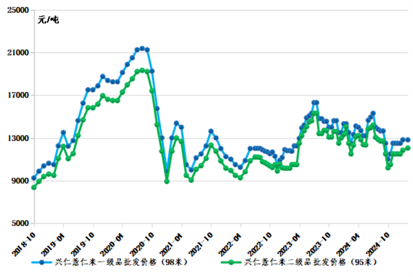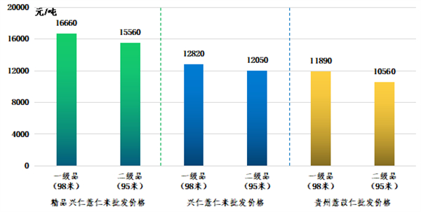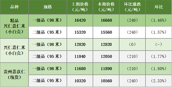 本期,精品兴仁薏仁米“98米”批发价格为16660元/吨,精品兴仁薏仁米“95米”批发价格为15560元/吨;兴仁薏仁米“98米”批发价格为12820元/吨,兴仁薏仁米“95米”批发价格为12050元/吨;贵州薏苡仁“98米”批发价格为11890元/吨,贵州薏苡仁“95米”批发价格为10560元/吨。
